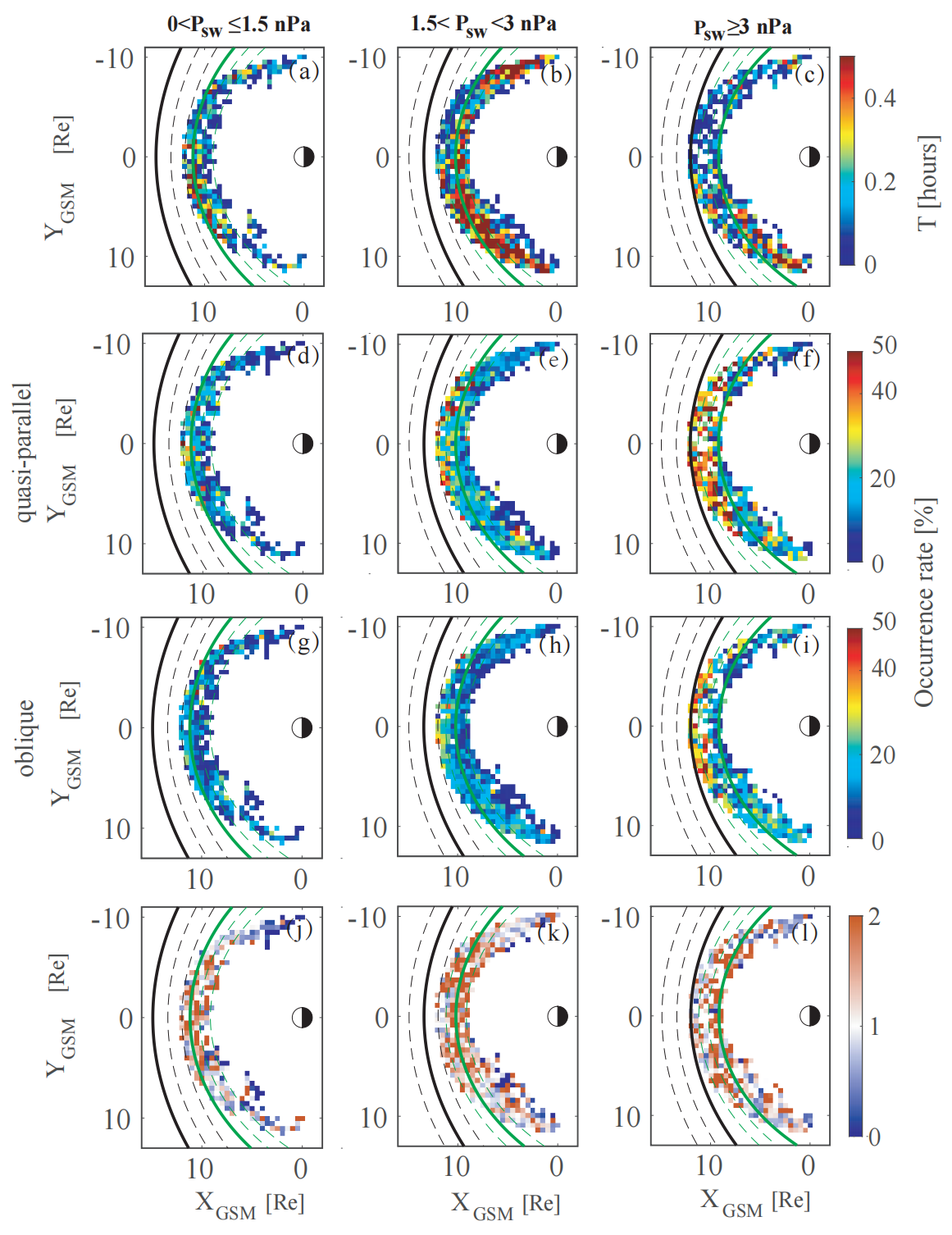 图1: 在XY-GSM平面中,哨声波在不同太阳风动压条件下的空间分布:(a–c)MMS-1的驻留时间,(d–f)准平行波的出现率,(g–i)倾斜波的出现率,以及(j–l)准平行波与斜传播波出现率的比值。