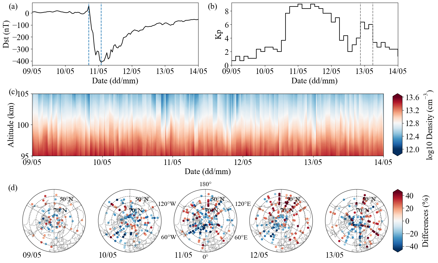 图1 磁暴期间的Dst与Kp指数的变化,以及SABER观测到的中高纬密度响应