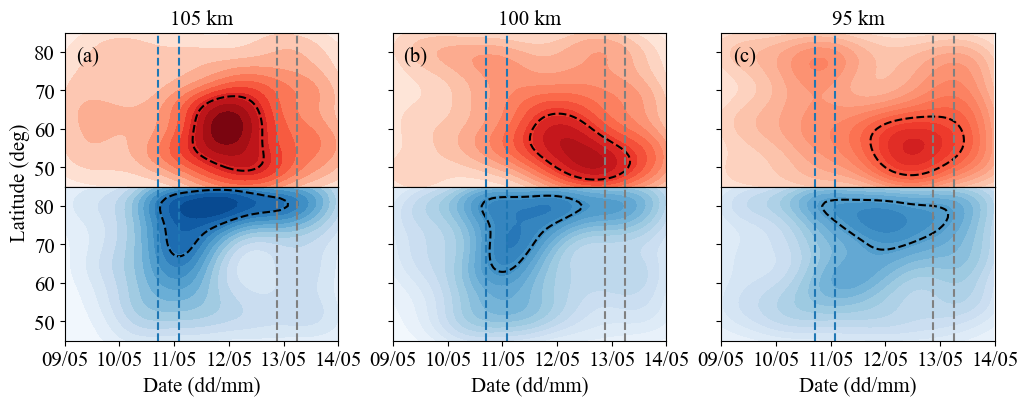 图2不同高度下显著密度响应点的纬度–时间分布,揭示了密度变化的纬度差异