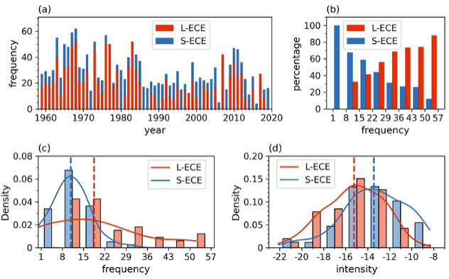 (a-b)两类东亚极端寒冷事件频次时间序列,及其所占百分比。(c-d) 两类东亚极端寒冷事件频次和强度概率密度分布。
